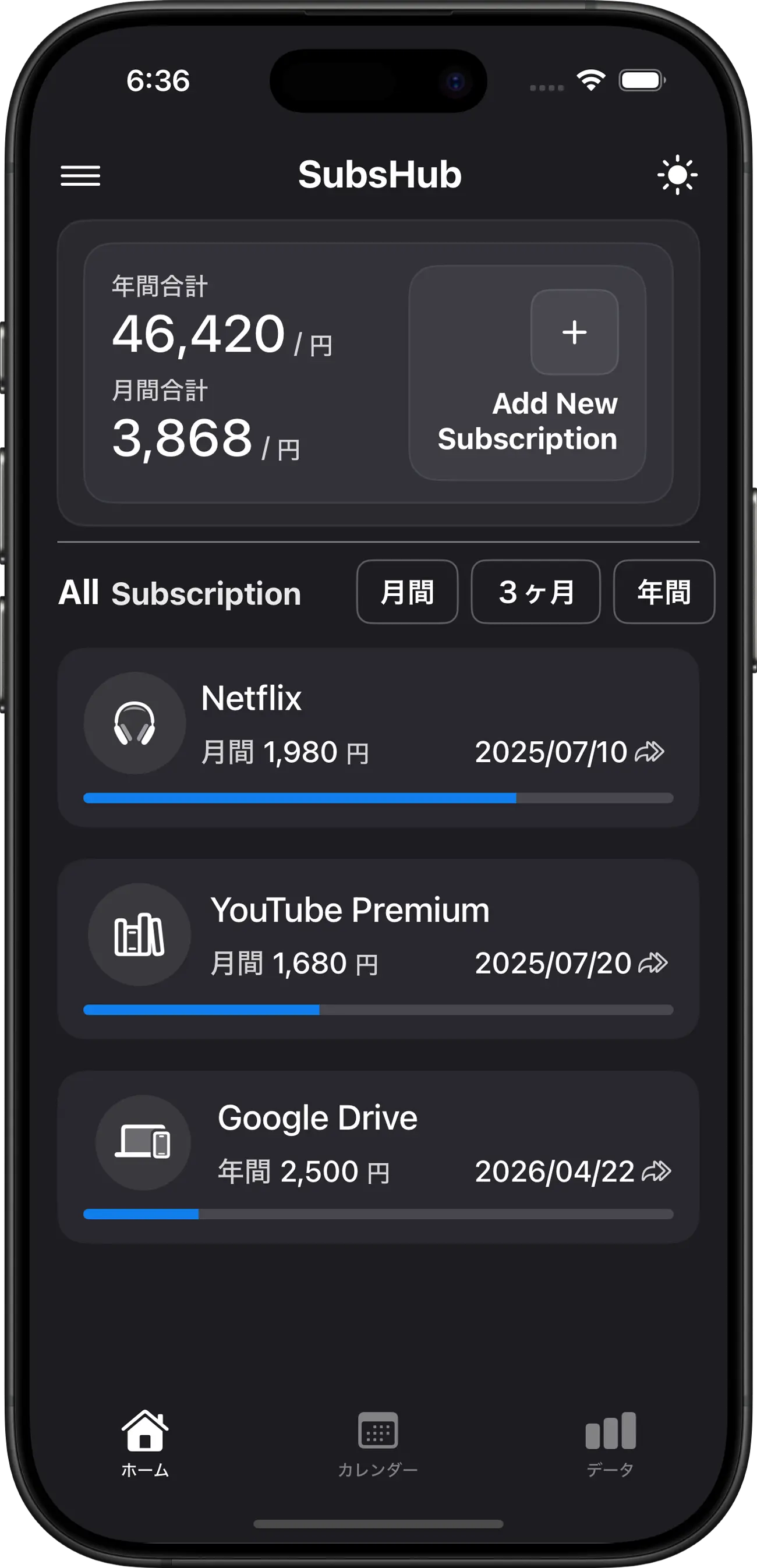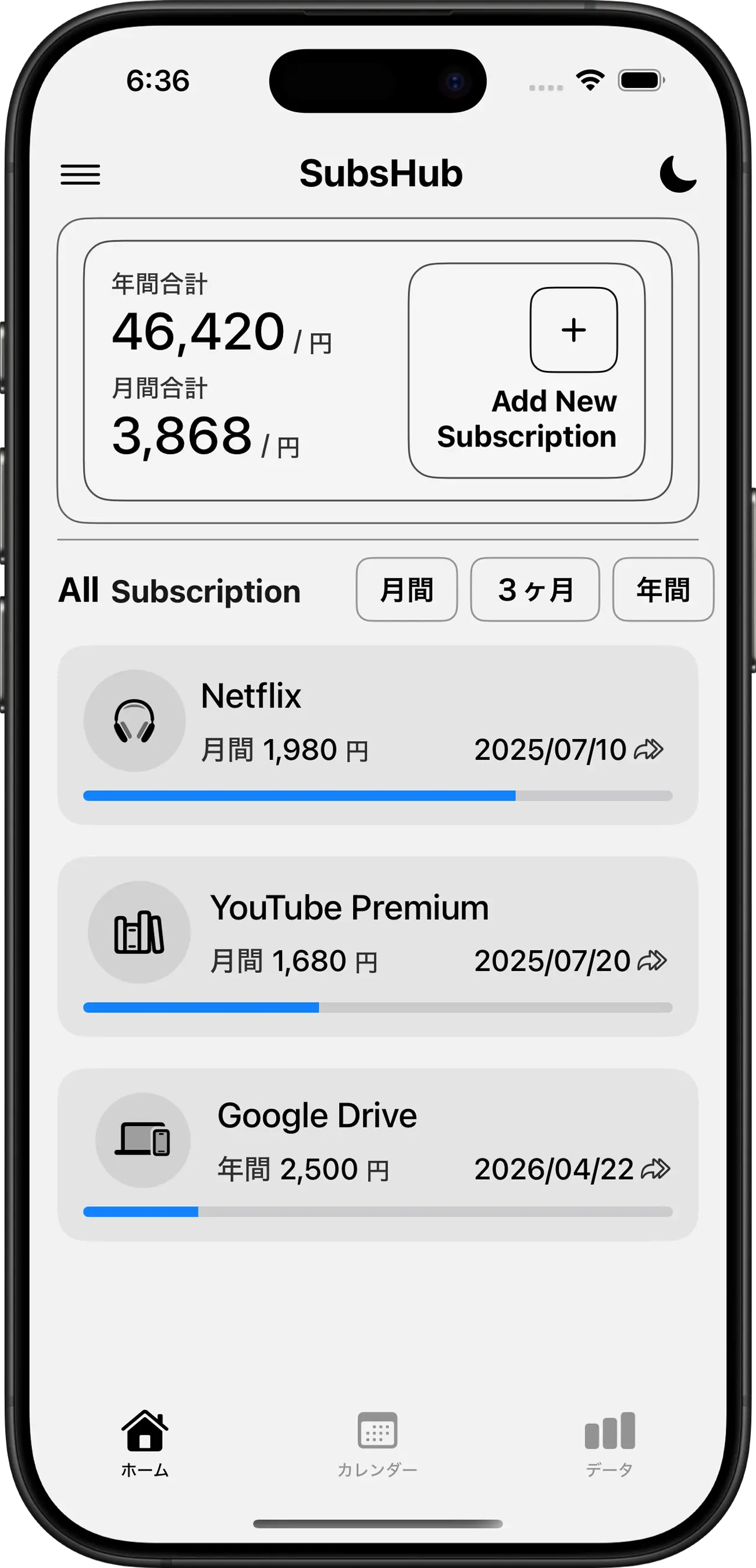日付の数字を追う必要はありません。青いプログレスバーが直感的に「支払いまでの余裕」を伝えます。一目で管理の優先順位がわかる、SubsHub独自の体験です。